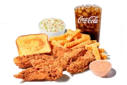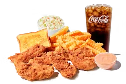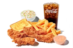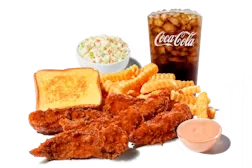 Zaxby’s Chicken Finger Plate includes crispy chicken fingers, golden fries, toast, and a dipping sauce for a complete and flavorful meal.