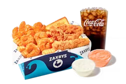 Zaxby’s ZaxSeas Surf & Turf Meal is the ultimate surf-and-turf combo, featuring crispy Southern Fried Shrimp paired with hand-breaded Chicken Fingerz. This hearty meal is served with a side of Texas Toast, crinkle fries, and a generous portion of Zaxtail Sauce for dipping, which combines the flavors of Zax Sauce® and cocktail sauce.